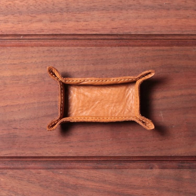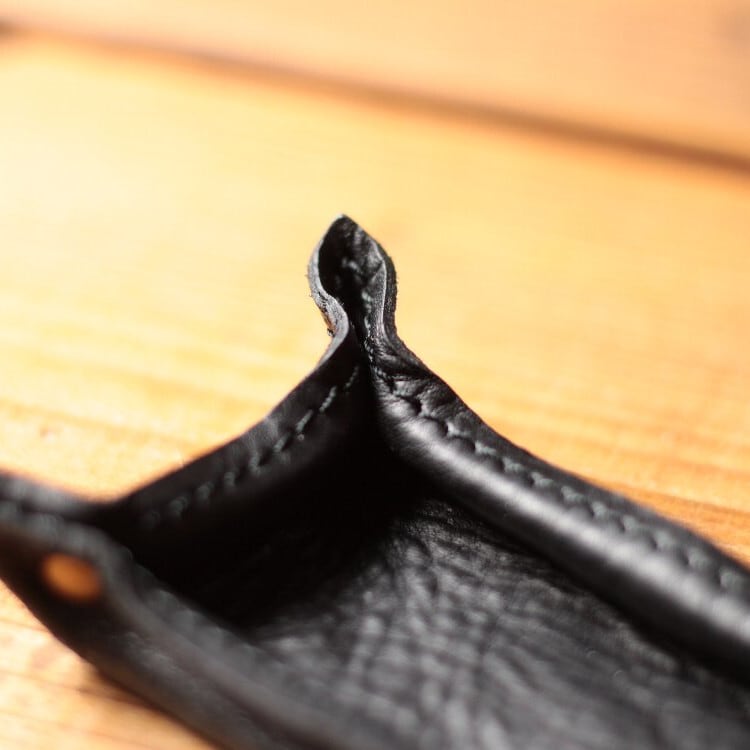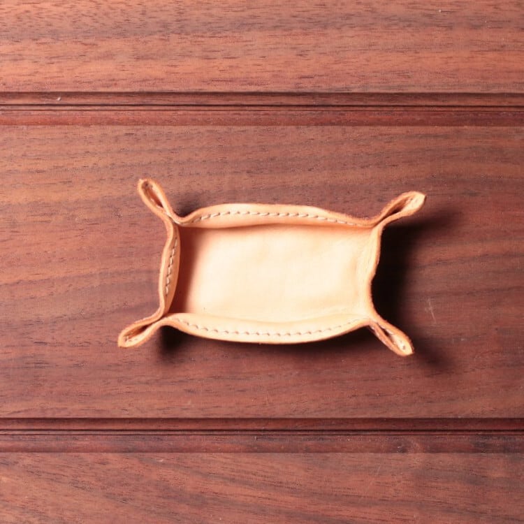 本来なら使われにくい、**表情豊かなシボ感(革の凹凸模様)**や、ほんのり色やけした部分をあえて活かし、唯一無二のトレーに仕立てました。
