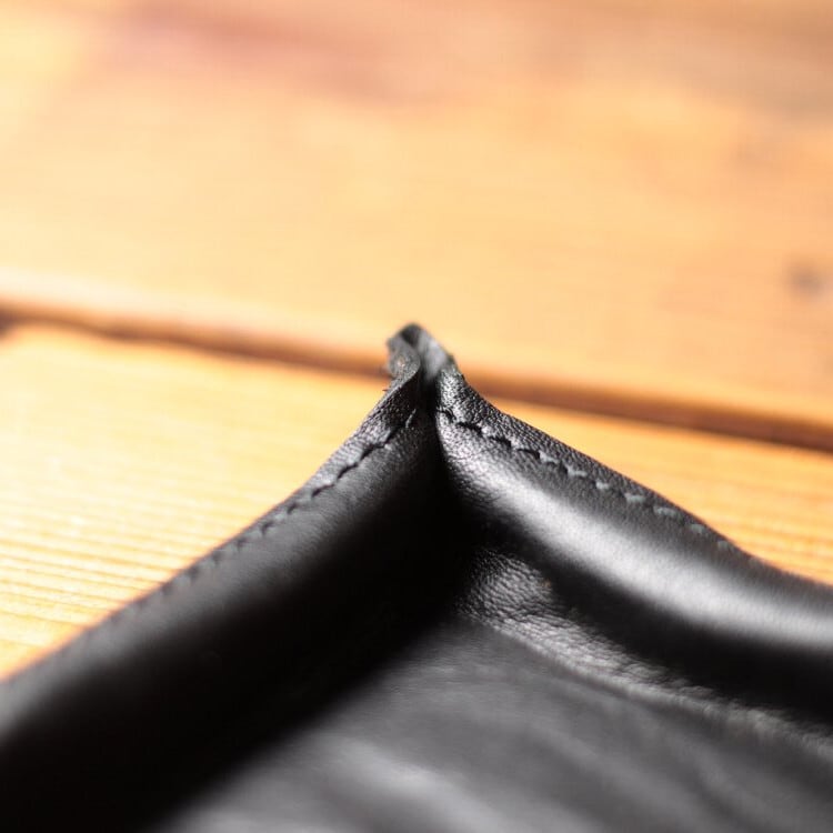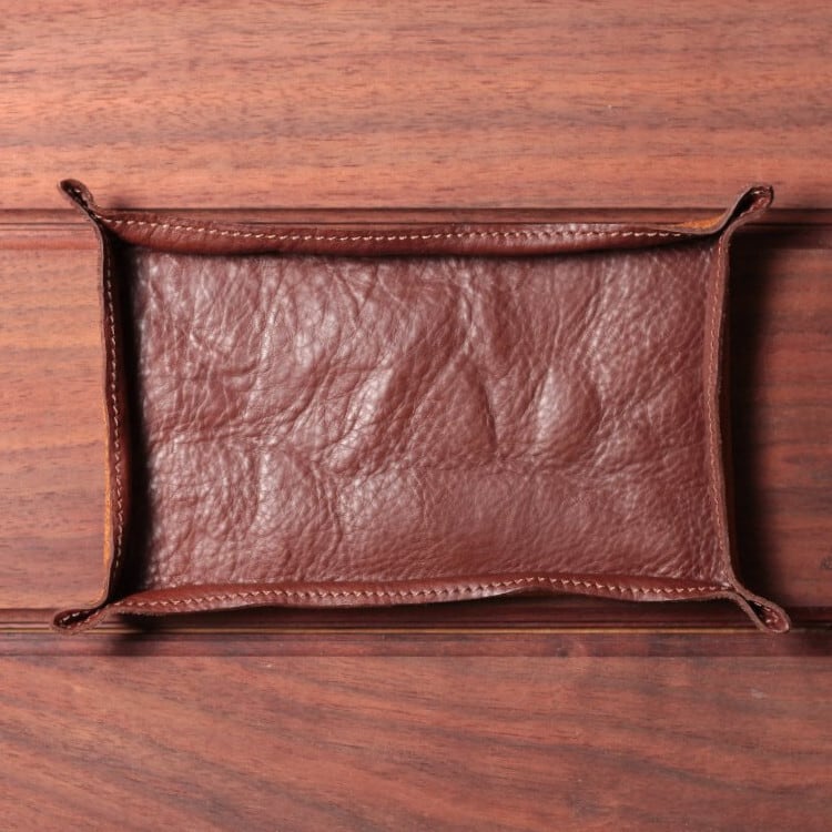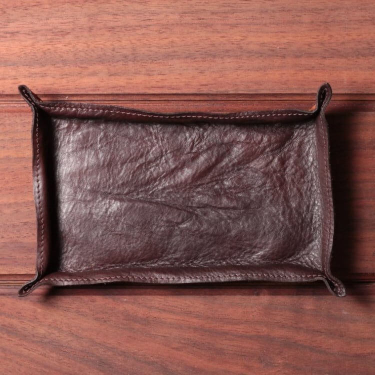 通常商品には使われにくい、**豊かなシボ感(革の凹凸模様)**や、味わいのある色やけを活かし、唯一無二のトレーへと仕立てました。