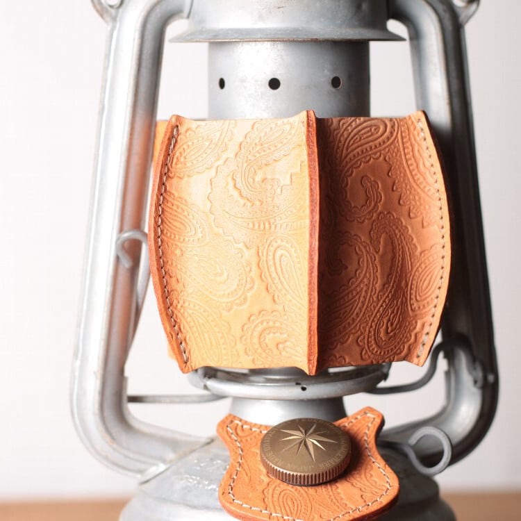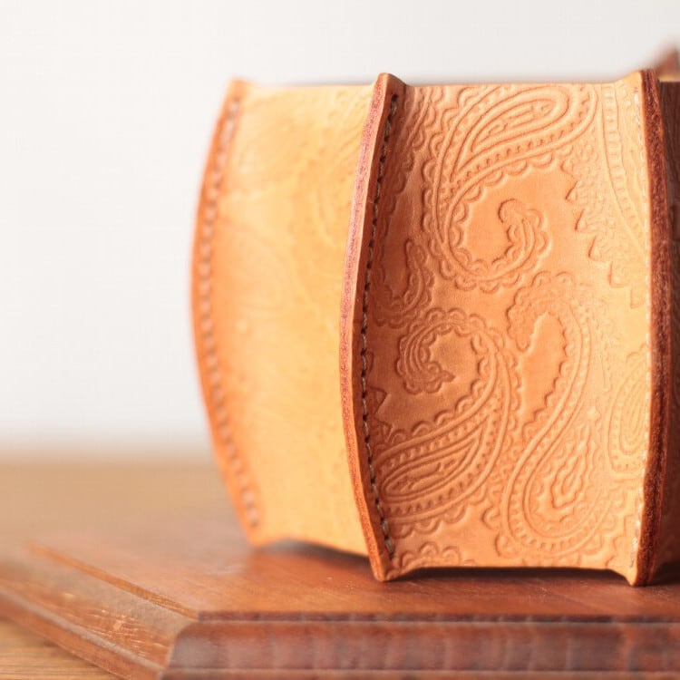 国産レザーをベースに、国内で丁寧にペイズリー柄のエンボス加工を施したこだわりの一枚。上質な素材と繊細な模様が織りなす表情は、手に取るたびに心を惹きつけます。